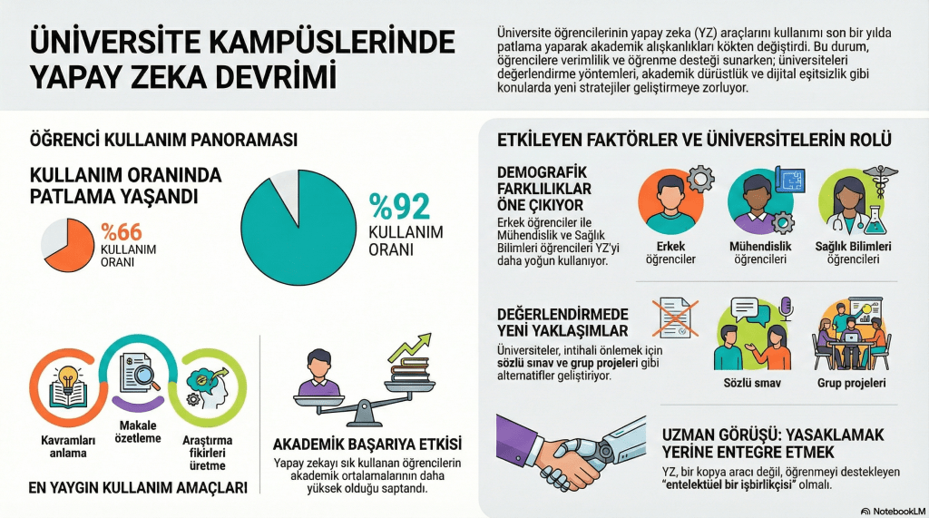 Üniversitelerde yapay zekâ kullanımının giderek artması, bu teknolojilerin akademik süreçler üzerindeki etkisini gündeme taşıyor. Türkiye ve Birleşik Krallıkta yapılan güncel araştırmalar, yapay zekânın üniversite öğrencileri arasında yaygın bir araç haline geldiğini ve kullanım biçimlerinin akademik başarı, değerlendirme yöntemleri ve eşitlik tartışmalarıyla doğrudan ilişkili olduğunu gösteriyor.